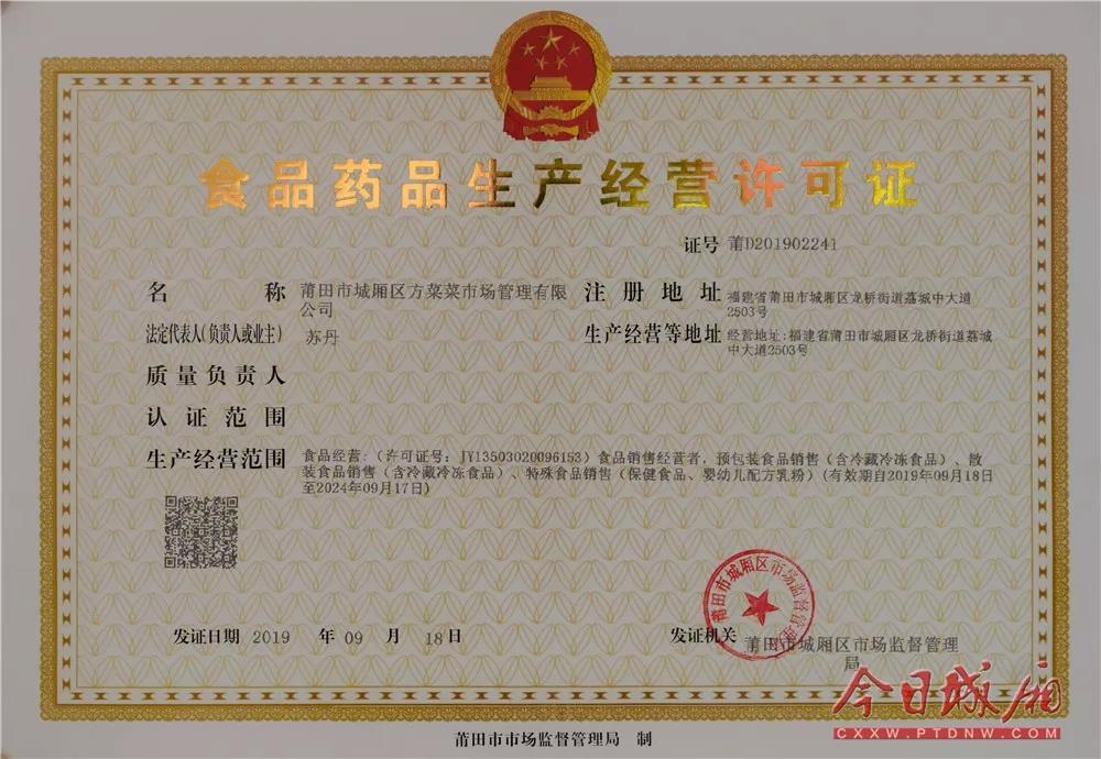 日前,莆田市首家申请食品药品审批“证照同办”企业城厢区方菜菜市场管理公司,领到由城厢区市场监督管理局颁发的营业执照和食品药品生产经营许可证,这标志着莆田市食品药品审批“证照同办”改革进入正式实施阶段。